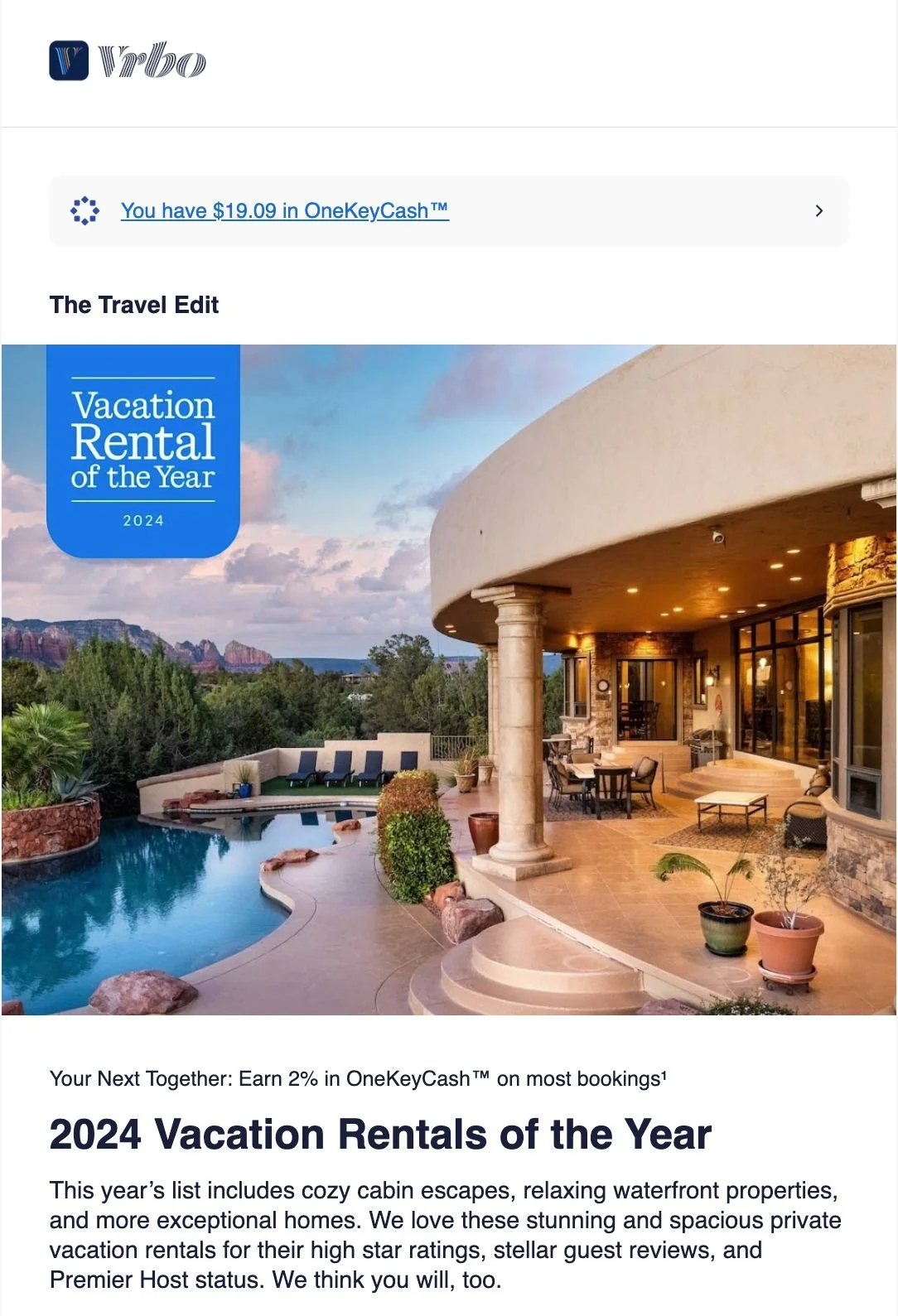 Wrote and edited emails for some of Vrbo’s most successful weekly campaigns, including Waterfront Homes and Beach Getaways.